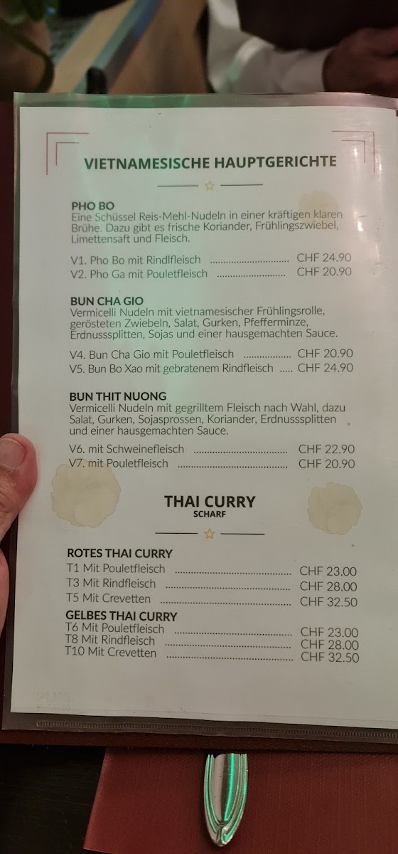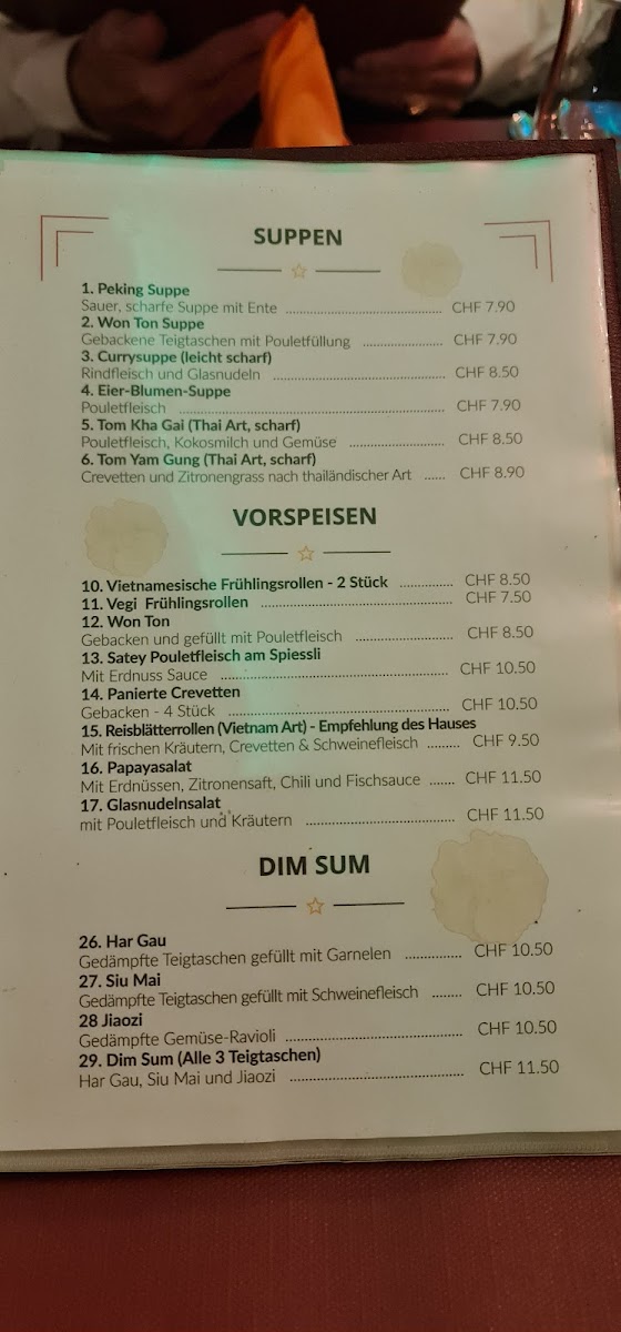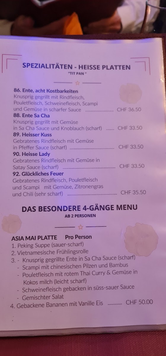 The menu at Asien Restaurant Mai offers a delightful mix of traditional Asian flavors with a focus on fresh ingredients. Among the standout appetizers, the Frühlingsrolle Crevetten is a must-try, perfectly crispy on the outside, with a savory shrimp filling that packs a punch of flavor. For those looking for something a bit more substantial, the restaurant’s variety of stir-fried and grilled dishes, such as the tender Szechuan-style beef and the fragrant Thai green curry, are excellent choices. Each dish is prepared with a careful balance of spices, making them both aromatic and satisfying. The restaurant also offers a selection of noodle and rice-based meals, each one vibrant and hearty, ideal for a fulfilling meal. Whether you're craving something light like the spring rolls or looking for a richer, heartier dish, Asien Restaurant Mai delivers an experience that will leave you coming back for more.